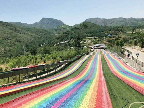 七彩焊滑——全長206米,是由七種顏色組合而成的旱地滑雪體驗項目,共分一條單人滑道,兩條三人滑道;游客從色彩斑斕的滑道上飛流而下,驚險、刺激、好玩。