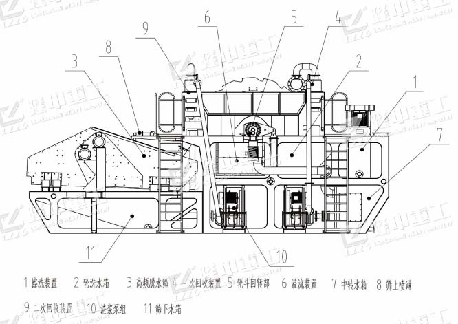 物料先經過擦洗機進行擦洗,除去砂顆粒表面附著的泥粉;擦洗后的物料進入輪洗洗砂機進行二次清洗;擦洗機和輪式洗砂機溢流水進入副水箱進而進入旋流器進行細砂回收,同時將擦洗和洗砂過程中的泥水由旋流器反水口溢流到尾水處理系統(tǒng)。經過擦洗機和輪式洗砂機清洗后的粗、細砂進入脫水篩進行脫水,脫水篩下水箱的水由泵送入旋流器進行第二次細砂回收,同時將泥水由旋流器反水口溢流到尾水處理系統(tǒng)。